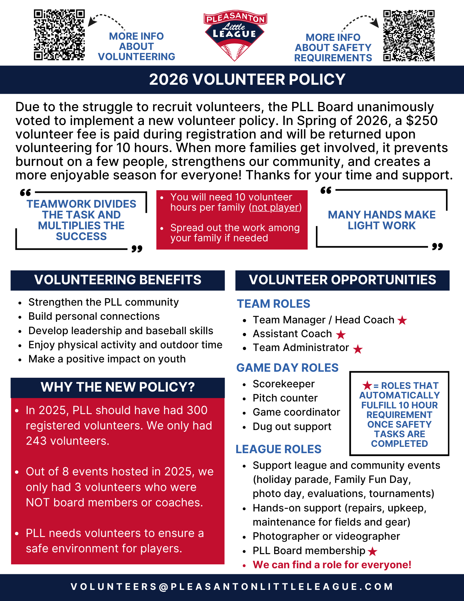 The $250 volunteer fee is fully refundable and is collected at registration as a deposit. Think of it as an assurance that each family will either volunteer or support the league financially. If your family completes the 10-hour volunteer requirement, the $250 is returned to you at the end of the season. We will process refunds directly back to your credit card via the SportsConnect registration system once your hours are verified. Pleasanton Little League does not want to keep this money – our goal is to have your volunteer support, not your deposit. The fee simply provides a tangible incentive to fulfill the volunteer commitment.